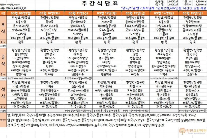[03월 09일~3월 15일] 주간식단표