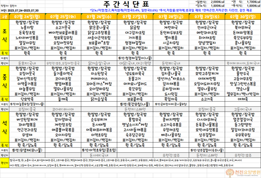 [7월 24일 ~ 7월 30일] 주간식단표 ♡