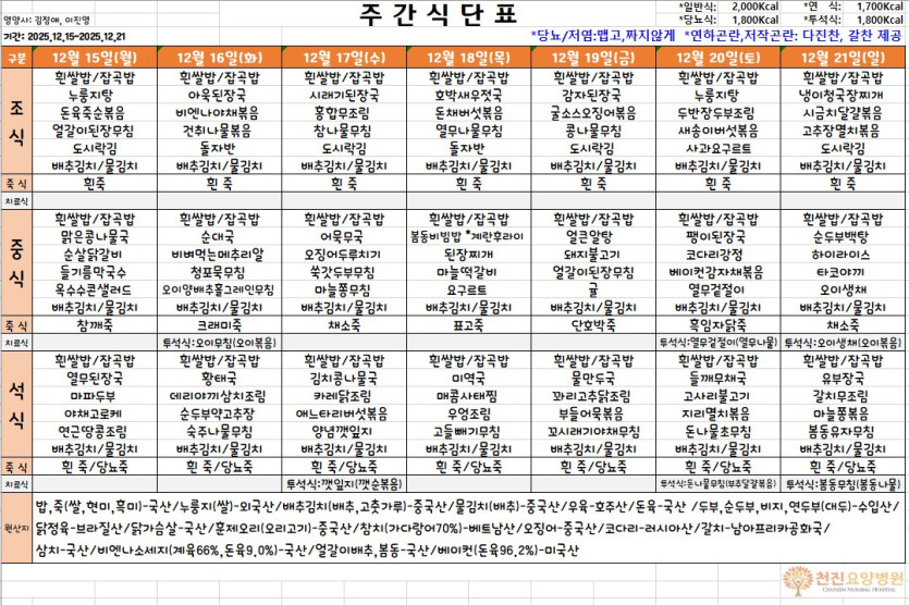 [12월 15일~12월 21일] 주간식단표