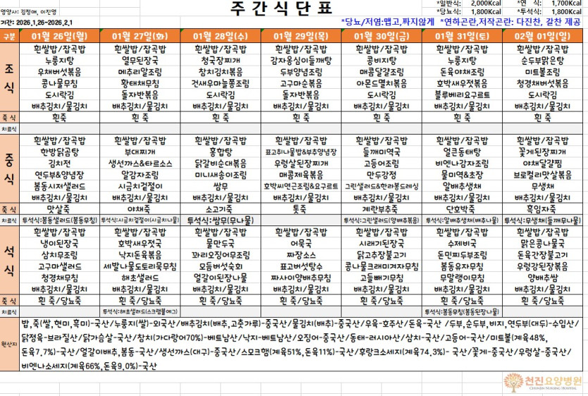 [1월 26일~2월 1일] 주간식단표